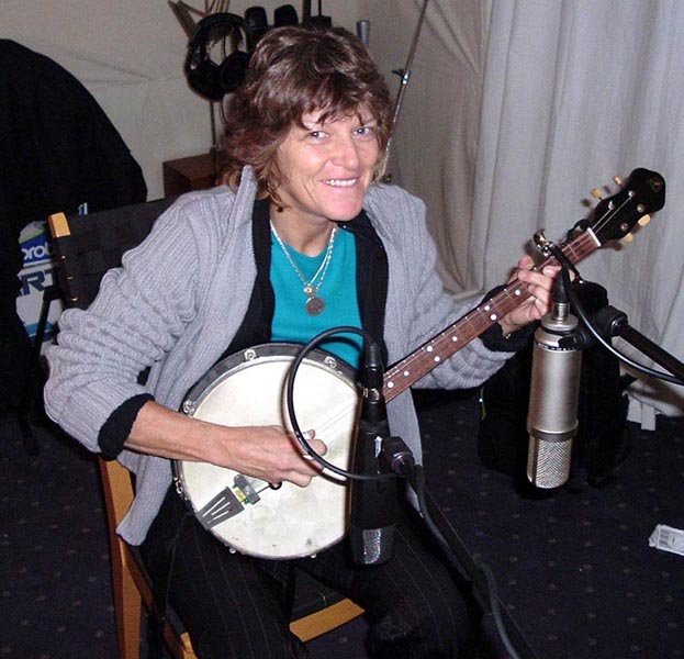 Caroline Aiken playing banjo for meike's album “live love travel free” 2006